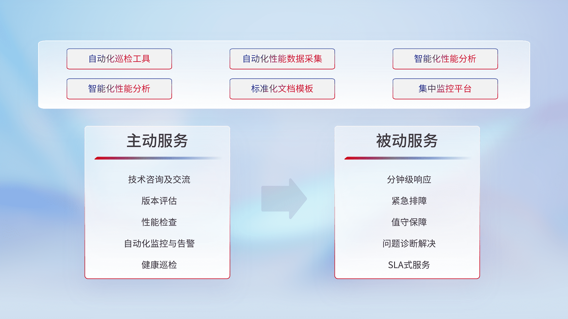 智能化工具和标准化文档,,,,保障服务质量,,,,提供主动服务(包含技术咨询、、、、版本评估、、性能检查、、、、自动化监控与告警、、、健康巡检)和被动服务包含(分钟级响应、、、紧急排障、、值守保障、、、、问题诊断解决、、、SLA服务)。。。